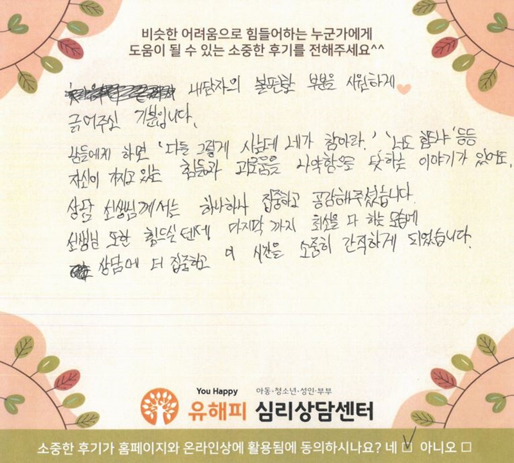 저는 이전에도 상담을 여러번 받아봤었습니다. 그 과정에서힘든 마음이 나아지는 경험도 하고, 마음의 회복력이 느는경험도 했었습니다. 그런데 생소한 환경에서 어려움을겪다보니...