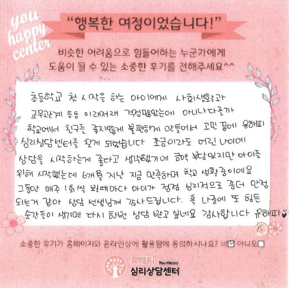 초등학교 첫 시작을 하는 아이에게 사회생활과교우관계 등등 이래저래 걱정 많았는데 아니나 다를까학교에서 친구를 좋지 않게 불편하게 만들어서 고민 끝에유해피 심리상담센터...