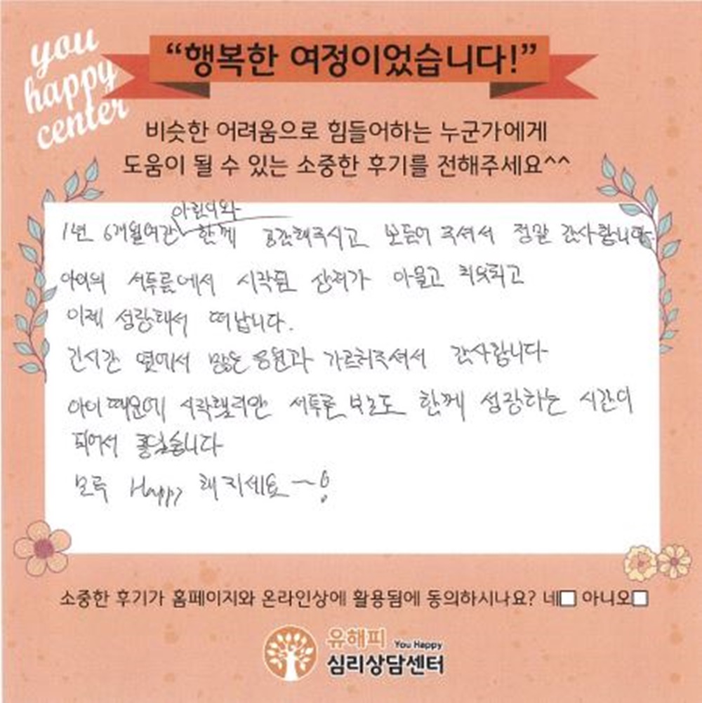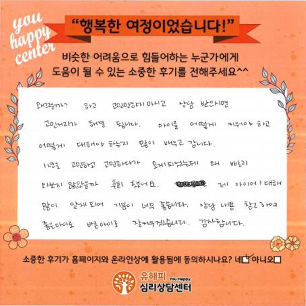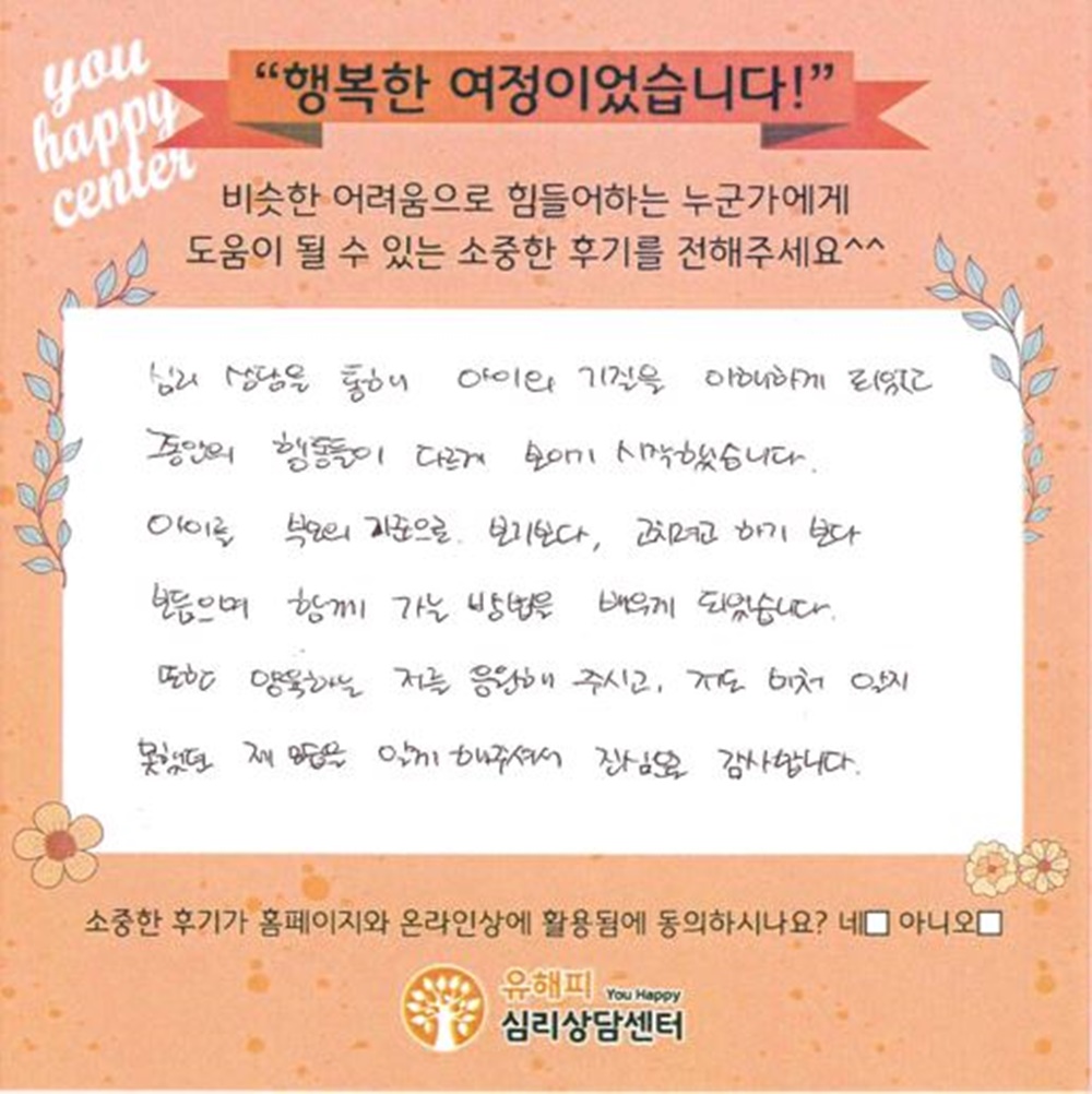 불안, 걱정, 답답함을 느끼며 눈물을 보이던 딸에게이제 해줄 수 있는건 마음의 치료인 상담밖에 없었습니다.급하게 예약했던 상담이었지만 딸의 마음을 헤아려주고부모의 마음과 ...