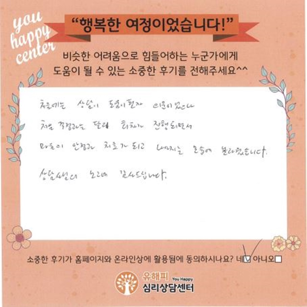2개월이라는 시간동안 제 얘기도 잘 들어주셨고, 부모님과의 사이에오래되었던 문제점도 개선이 잘 되었습니다. 상담선생님도많이 착하셨고 얘기하나 하나에 공감대 형성 해주셔서...