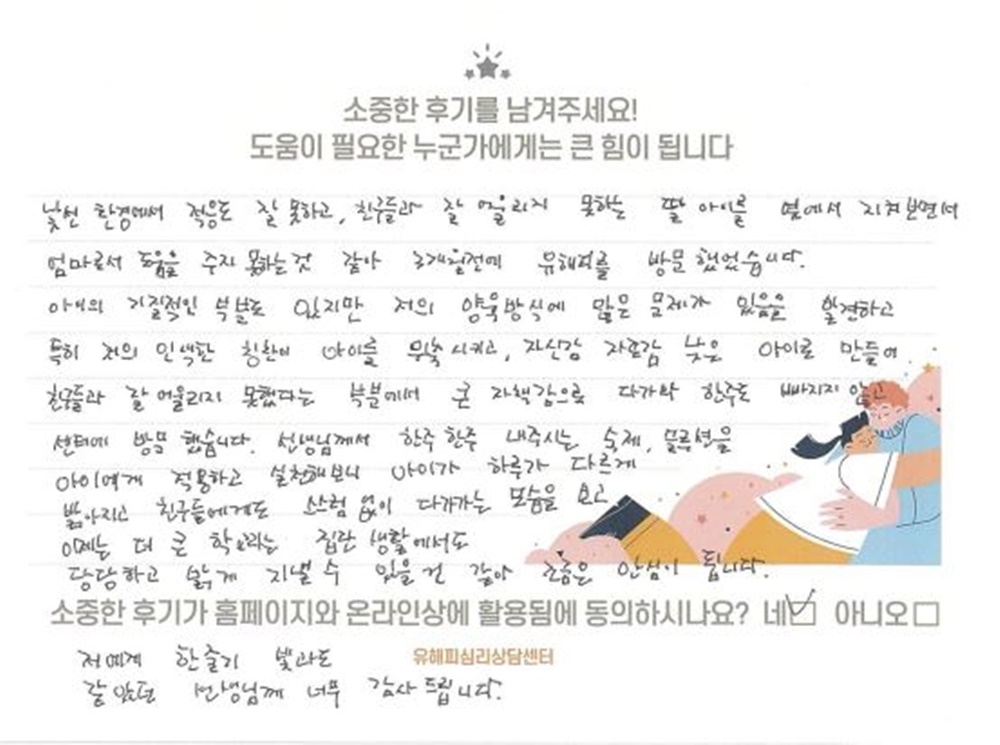 왜그럴까? 하고 고민만하지 마시고 상담 받으시면고민거리가 해결 됩니다. 아이를 어떻게 키워야 하고어떻게 대해야 하는지 많이 배우고 갑니다.1년을 고민하고 고민하다가 오게되...