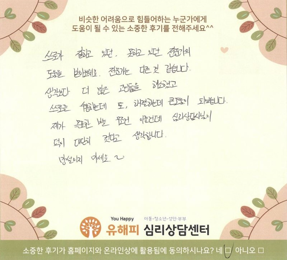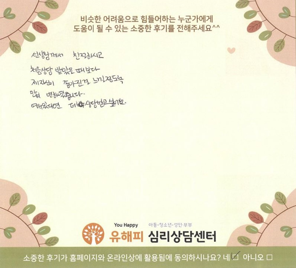 선생님께서 친절하시고처음상담 받았을 때보다제 자신이 좋아진걸 느낄정도로많이 변하였습니다.여유있다면 더 상담받고싶어요.