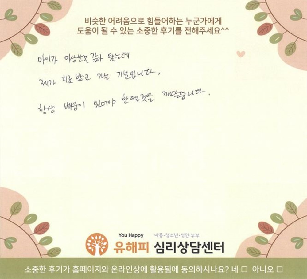 아이가 이상한것 같아 왔는데제가 치료 받고 가는 기분입니다.항상 배움이 있어야 한단 것을 깨닫습니다.