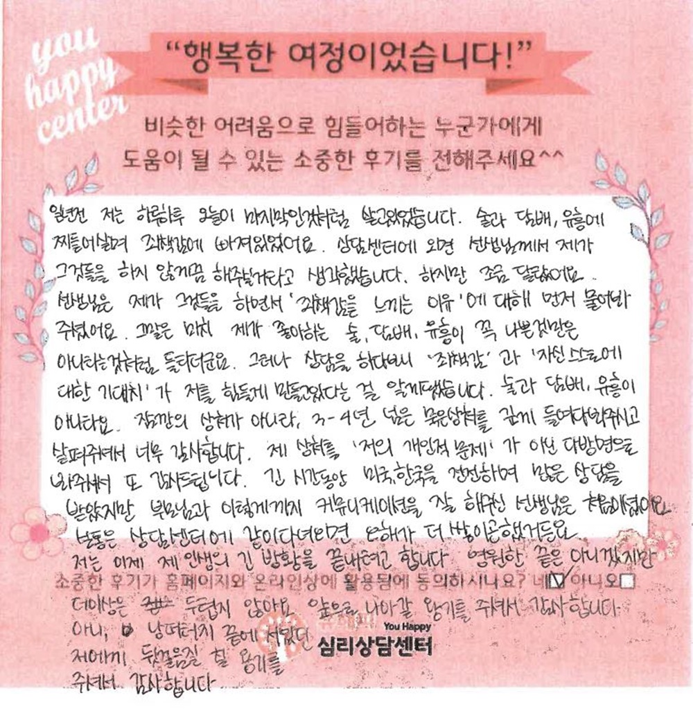 일년전 저는 하루하루 오늘이 마지막인것처럼 살고있었습니다. 술과 담배, 유흥에찌들어살며 죄책감에 빠져있었어요. 상담센터에 오면 선생님께서 제가그것들을 하지 않게끔 해주...